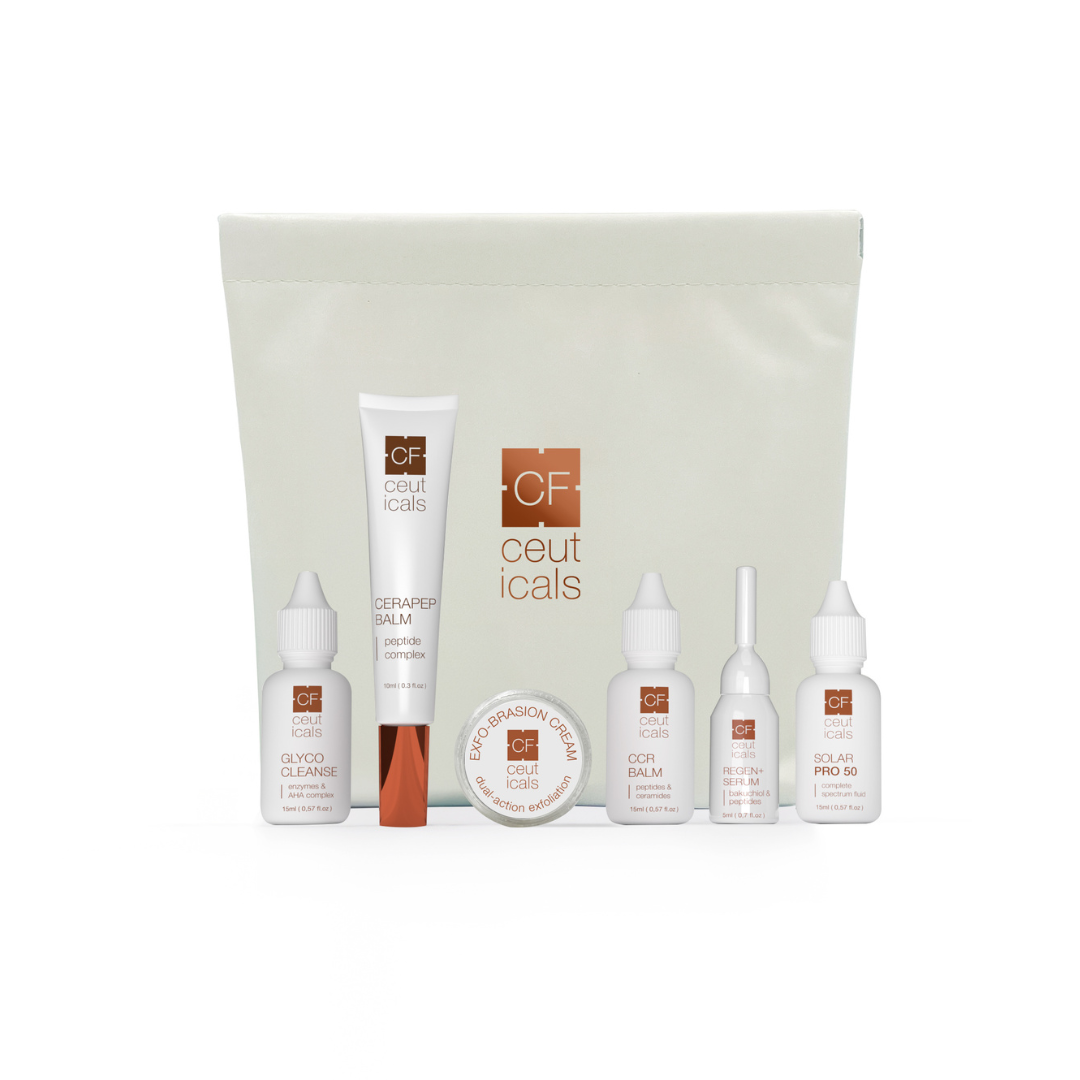 Crème Snap Pouch: 15 ml Glyco Cleanse, 5 ml Exfo-brasion Cream, 5 ml Regen Serum, 10 ml CeraPep Balm, 15 ml CCR Balm, 15 ml Solar Fluid 50.